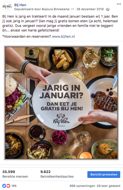 Grote merken als HEMA en Coolblue doen dat natuurlijk al heel goed, door opvallende berichten te plaatsen die reacties uitlokken (video’s doen het erg goed!) en door vervolgens perfect te reageren. Maar ook als kleiner merk kun je in gesprek gaan met je volgers, als je het maar goed aanpakt. Zo was Bij Hen, een restaurant in Alphen aan den Rijn, in januari jarig. Ter ere van die verjaardag beloofde Bij Hen iedereen die óók in januari jarig was een gratis etentje. Dat zorgde voor bijna 900 reacties en een flink bereik; ruim 35.000 mensen zagen Bij Hen in hun timeline voorbij komen.