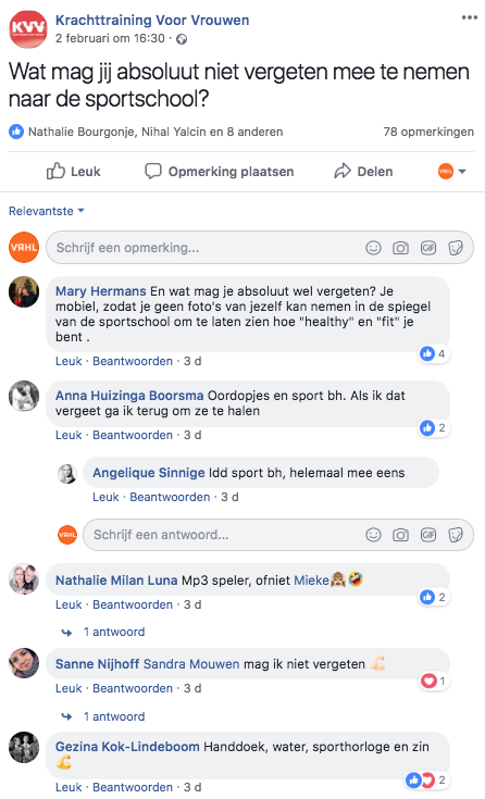 Dat vond Rowan Blom, de oprichter van de community, zelf ook bizar. “Zo veel bestellingen had ik niet verwacht”, vertelt ze net nadat de eerste editie van haar magazine bij haar volgers op de mat ligt. “Het vertrouwen ontstaat met name doordat ik vanuit mijn merk op een persoonlijke manier contact heb met mijn volgers. Ik stel volgers regelmatig alleen maar een vraag en reageer zo veel mogelijk op de reacties die daarop volgen. Volgers kunnen mij persoonlijk mailen; ze mailen dan niet naar een info-adres, maar naar een mailadres met mijn persoonlijke voornaam. En als ik een week vakantie heb meld ik dat en laat ik hen weten dan ze mij in noodgevallen op mijn 06 kunnen bellen.” Kortom: Krachttraining Voor Vrouwen heeft een gezicht gekregen en is er altijd voor haar volgers. En dat zorgt ervoor dat posts van KVV soms tot complete gesprekken leiden.