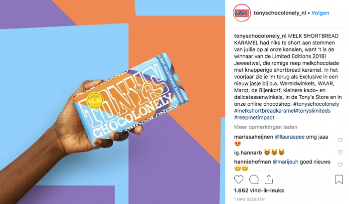 Wat vinden je volgers mooi of interessant, wat zet hen aan tot een aankoop en waar zitten ze totaal niet op te wachten? Dat wil ieder merk wel weten, want dat maakt het veel makkelijker om effectieve content te maken. Of om producten aan te bieden die écht in de smaak vallen bij jouw publiek. Zo liet Tony’s Chocolonely hun volgers stemmen op hun favoriete limited edition. De winnende reep werd in het vaste assortiment opgenomen. De drie limited editions ontvingen bij elkaar bijna 7.000 likes (= stemmen).