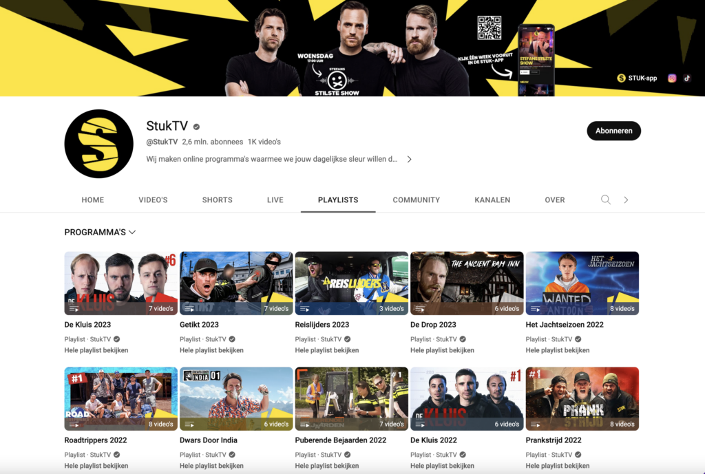 Wie het in Nederland bijvoorbeeld echt goed doen zijn de jongens van StukTV. Giel, Thomas en Stefan maken video’s met uitdagende en grappige opdrachten en zetten die op YouTube. Met elke zaterdag om 17.00 uur een nieuwe video weten hun meer dan 2,6 miljoen volgers precies wanneer zij een nieuwe video kunnen verwachten.