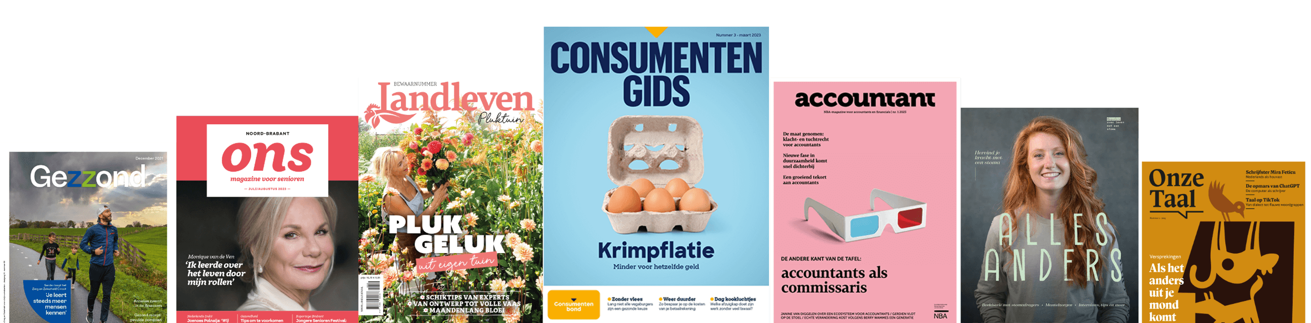 Onze vormgevers zijn gespecialiseerd in de vormgeving van branchemagazines, jubileumtijdschriften, private label magazines, consumentenbladen en andere periodieke of eenmalige magazines. Zo verzorgen we de vormgeving van de Consumentengids, Landleven, Plus Magazine en Onze Taal. Daarnaast zijn er tal van opdrachtgevers die ons (ook) inzetten voor de bladformule, de contentstrategie, de redactie en/of het drukwerk.