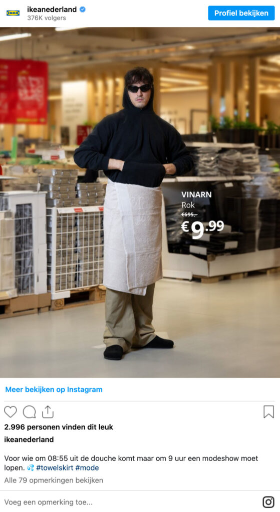 Het luxe modemerk Balenciaga introduceert een rok die verdacht veel op een handdoek lijkt. Voor een bedrag van € 695 heb je ‘m in je kast hangen. Dat kunnen wij ook, dacht IKEA. Maar dan wel voor een wat schappelijker prijs. Leuke inzending, Willemijn!