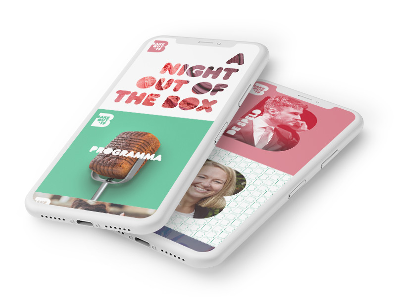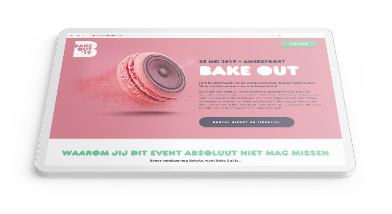 Met de zoete kleuren uit de bakkerij en een moderne, bijna kunstzinnige vormgeving was de stijl voor Bake Out geboren. De unieke visuals weerspiegelen de inhoud van de avond: inspirerende sprekers (het ‘microfoonbrood’) en feest (de ‘macaron-dj-plaat’).