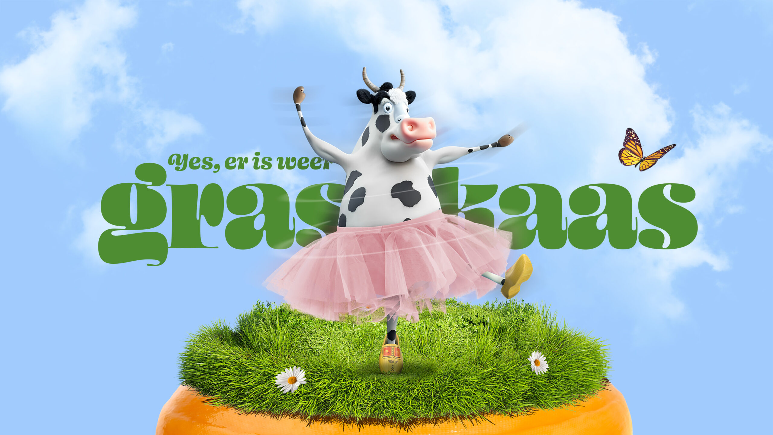 De kracht zit hem in de herhaling en dus is eenheid het kernwoord. Hoe meer boeren, producenten en handelaren op een eenduidige manier over graskaas communiceren, hoe groter het succes. Dus ontwikkelden we een leuk, herkenbaar beeld met een dansende koe. Slaat natuurlijk op de blije koeien die na de winter voor het eerst weer – dansend – de wei in huppelen en daarna de melk geven voor die lekkere kaas.