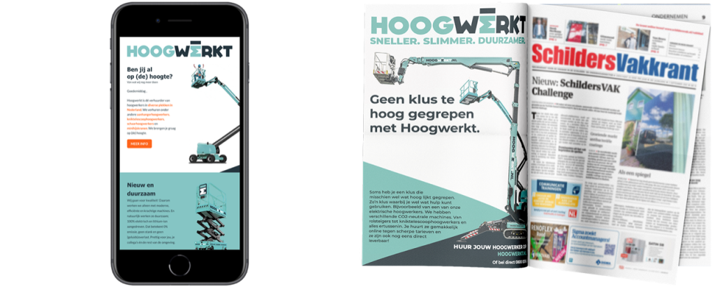 Een aansprekend concept dat onderscheidend is van de uitingen van andere verhuurbedrijven. Voor deze doelgroep – die toch bestaat uit ietwat traditionele branches – worden al snel ook de traditionele middelen ingezet. Hoogwerkt wilde vernieuwen. Wij denken dat dat goed is gelukt.