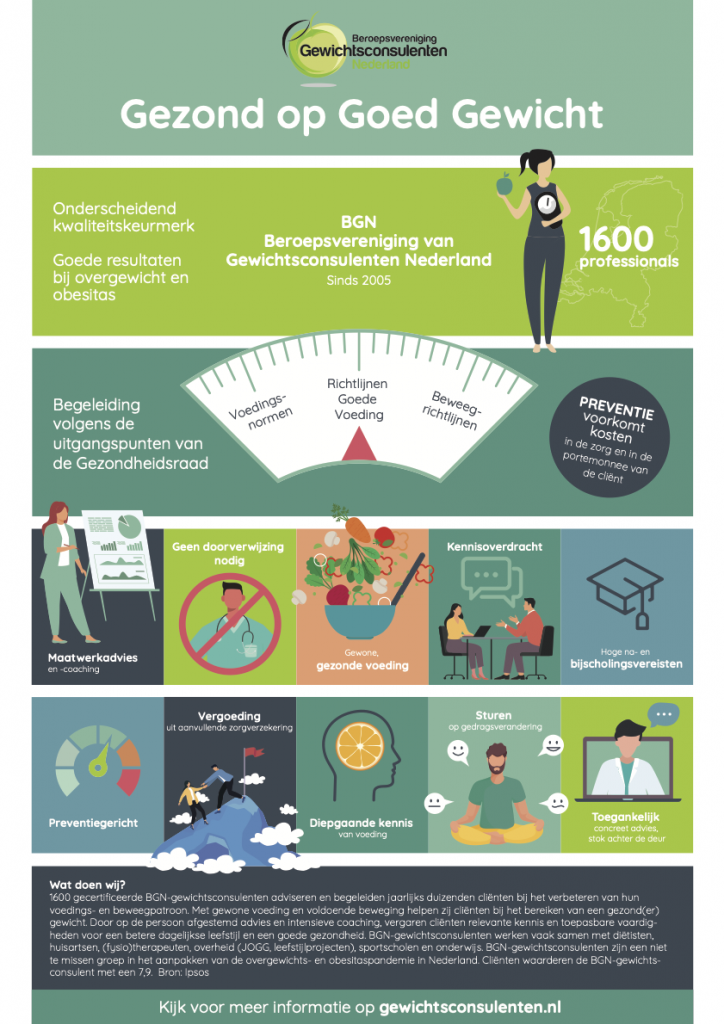 Om de campagne ’n beetje te begrijpen, is het goed om te weten dat gewichtsconsulenten geen medisch professionals zijn en dus ook geen zieke mensen begeleiden. BGN-gewichtsconsulenten willen ziekte (diabetes, hart- en vaatziekten…) juist voorkomen, door mensen te ondersteunen om hun leefstijl aan de hand van kleine aanpassingen te verbeteren. Dat betekent overigens niet dat een gewichtsconsulent ‘maar wat doet’. Want BGN-gewichtsconsulenten hebben een serieuze opleiding gevolgd en baseren zich op de (wetenschappelijk onderbouwde) voedingsrichtlijnen van de Gezondheidsraad.