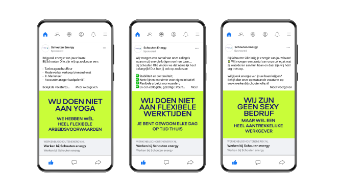 Hoe vind je voor een op het eerste oog niet-zo-sexy, maar wel heel stabiel en succesvol familiebedrijf in transitie, tóch (jonge) nieuwe werknemers? In tijden waarbij je als sollicitant overgehaald wordt met havermelkcappuccino’s, bedrijfsyoga en remote werken, is het noodzaak om op een andere manier op te vallen als je dit niet in huis hebt. Bij Schouten Energy (voorheen ‘Schouten Olie’) liepen ze hier tegenaan en daarom schakelden ze ons in voor een personeelswervingscampagne.