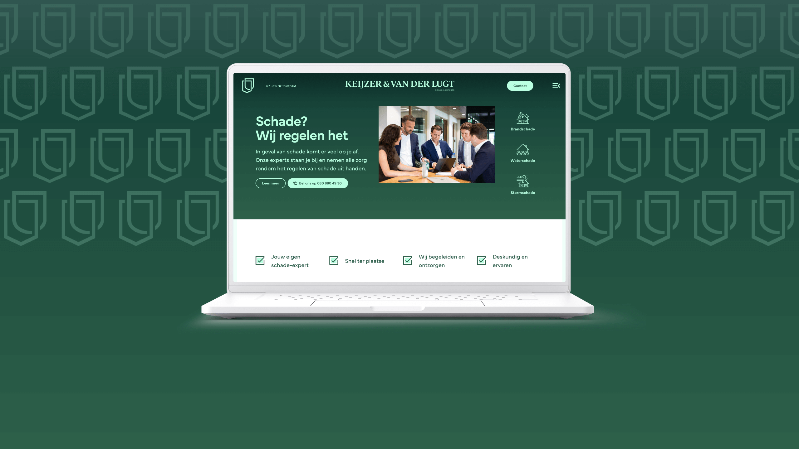 Als je bij Keijzer & Van der Lugt komt, komt het goed met je brand-, water- of stormschade. Ze denken verder mee dan alleen het financiële aspect – ze regelen bijvoorbeeld ook een vervangend pand – en focussen op kwaliteit van hun dienstverlening. Het bureau wil vertrouwen uitstralen en daarom is in de corporate identity met groene kleuren gewerkt. Groen staat voor veiligheid, maar ook voor groei. En dat past dan weer bij de ambities van het bureau.