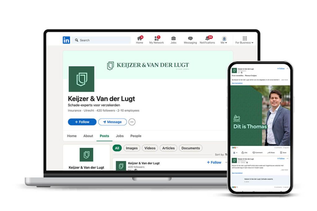 Tot nog toe was het bureau nog niet zo actief op LinkedIn en dat betekent dat in de strategie ook aandacht is voor het genereren van een groter bereik en nieuwe volgers. Om die reden wordt maandelijks geadverteerd op LinkedIn. Inmiddels pakken we ook diverse andere klussen voor Keijzer & Van der Lugt op, zoals het ontwerp van posters, corporate brochures en koffiekopjes. Leuk!