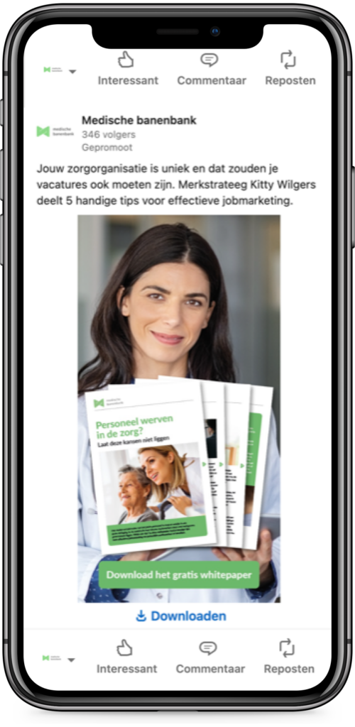 De doelgroep vult z’n mailadres natuurlijk niet zomaar in en daarom bedachten we in samenspraak met BSL wat daar tegenover moest staan. Het werd een voor de doelgroep relevant whitepaper met tips om personeel te werven in de zorg. Wij verzorgden de redactie en de vormgeving van het whitepaper. Ook de LinkedIn-berichten voor de campagne creëerden wij.