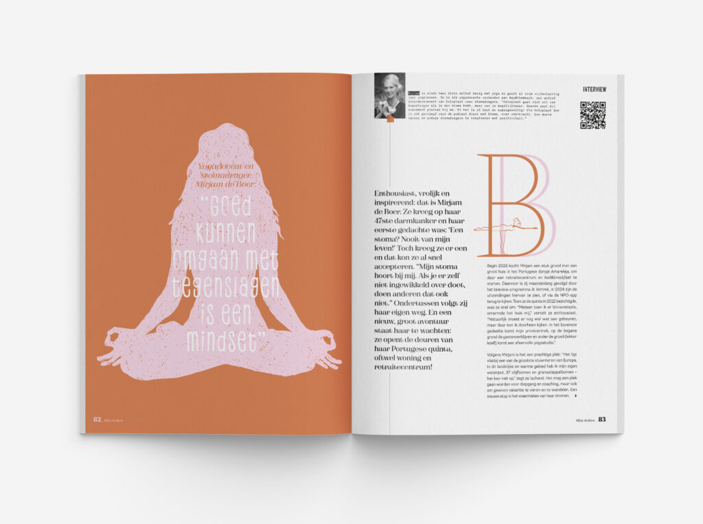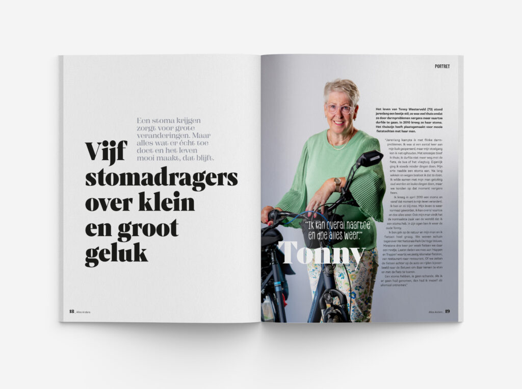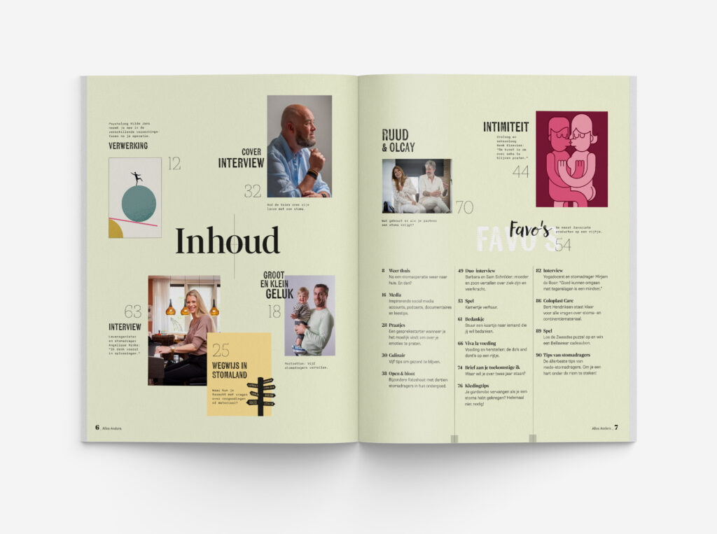 We maakten een magazine met een publieksuitstraling, waarbij Coloplast minimaal herkenbaar is als afzender. Het idee hierachter is dat lezers in deze fase zich vooral bezighouden met vragen als: hoe verloopt herstel? Op welke vergoedingen heb ik recht? En hoe gaat mijn leven er nu uitzien? We geven praktische tips, interviewen een psycholoog over het verwerkingsproces en vertellen de verhalen van stomadragers.
