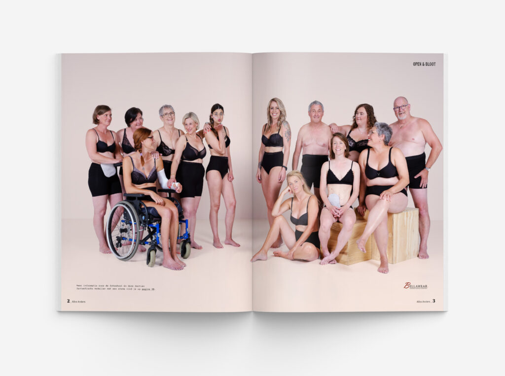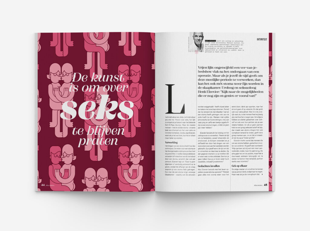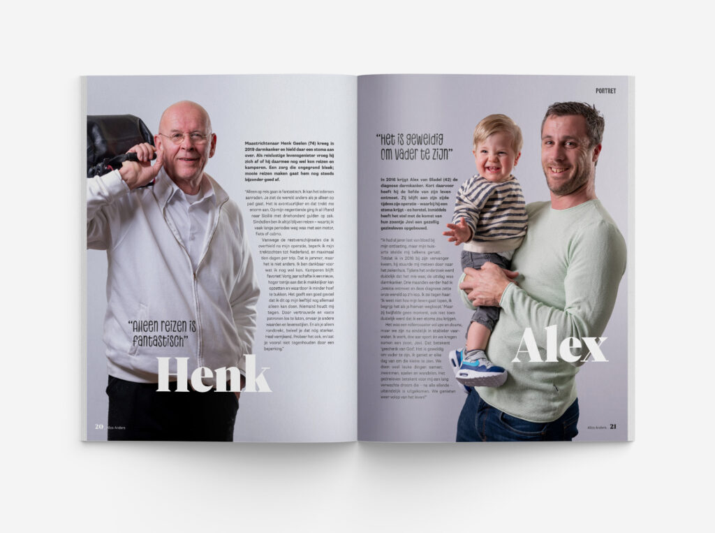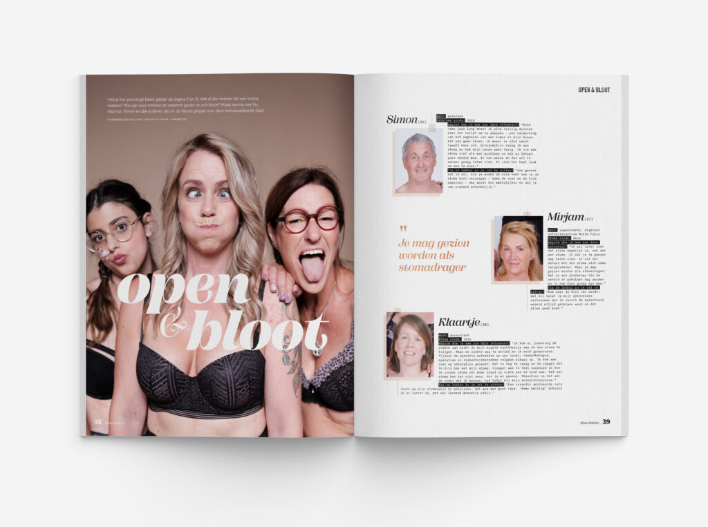 Het toppunt van deze opdracht was toch wel de bijzondere fotoshoot waarbij we stomadragers in hun ondergoed fotografeerden, om het onderwerp te normaliseren. Met twee fotografen doken we een hele dag de studio in en dat resulteerde in prachtige foto’s die de eerste twee pagina’s van het magazine sieren. Dat is nog eens een binnenkomer!