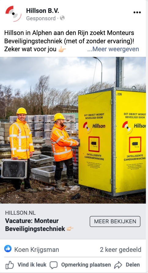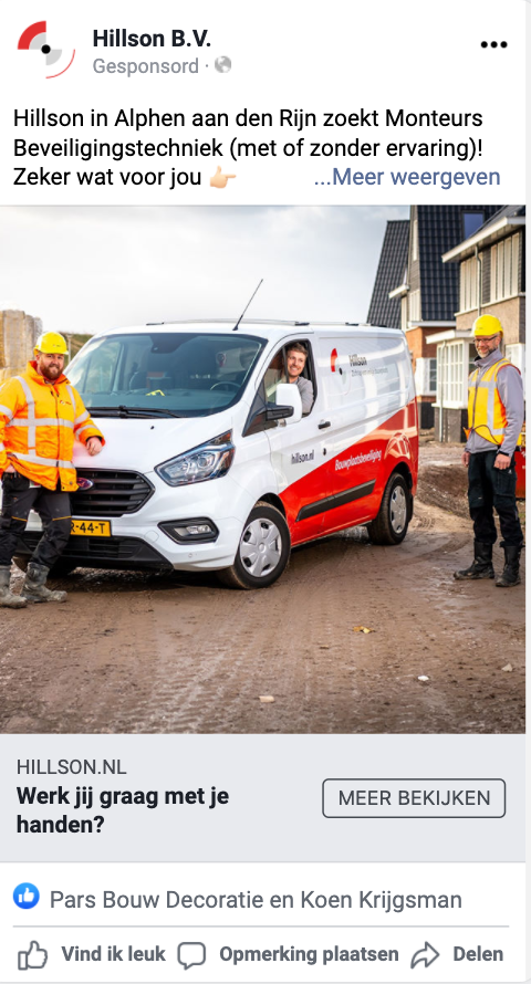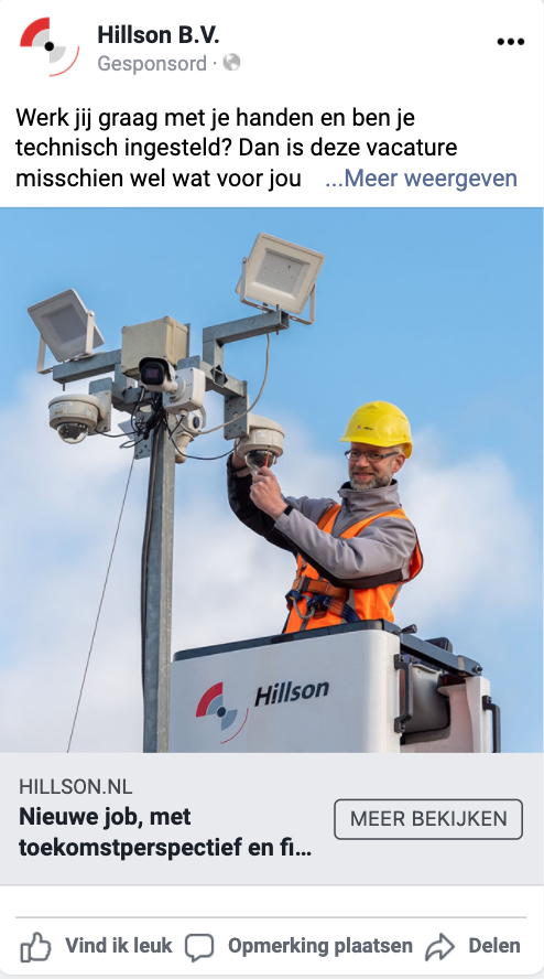 Via Facebook en Instagram kunnen we per vacature een hele specifieke doelgroep targeten. We stelden een campagne in, waarbij we ons richtten op zowel een technische als een niet-technische doelgroep. De technische doelgroep heeft ervaring en is dus heel interessant voor Hillson. Maar ook als je geen ervaring in de techniek hebt, kun je bij Hillson aan de slag (leren in de praktijk). Voor bijvoorbeeld bouwvakkers en hoveniers is een baan als monteur interessant. Het werk is fysiek een stuk minder zwaar. Ook hen pakten we dus mee in deze campagne. De vacature is ook gedeeld in lokale vacature-groepen op Facebook. We maakten stoere, aansprekende foto’s op de bouwplaats om erbij te publiceren.