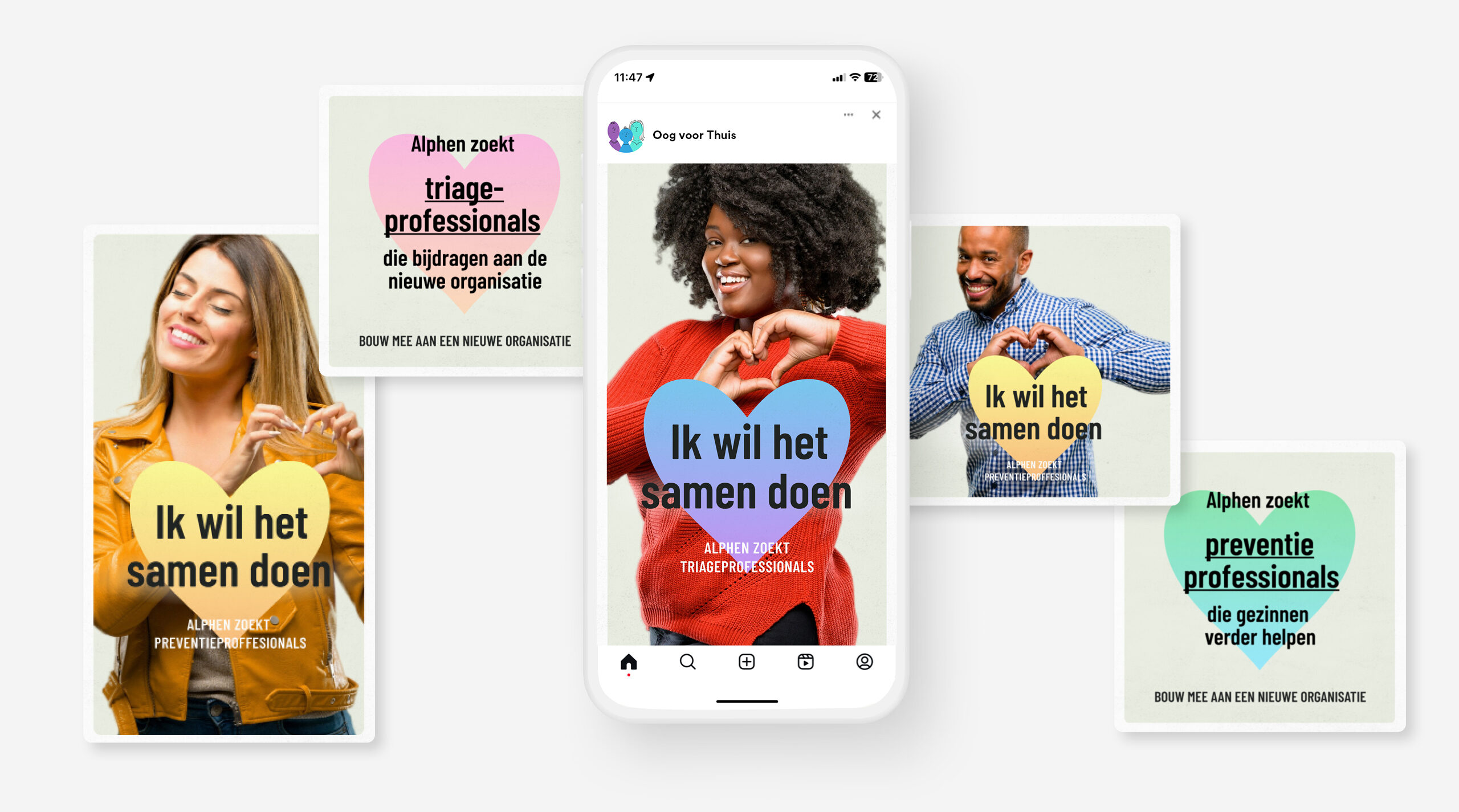 Het doel van de nieuwe organisatie is om de jeugd- en gezinshulp dichter bij gezinnen te organiseren. Dat gebeurt door met lokale teams te werken. Hierdoor zien de professionals het beter wanneer hulpvragen of risico’s ontstaan, en kan eerder ondersteuning worden geboden, zodat zwaardere hulp kan worden voorkomen. Met betrekking tot de communicatie had de gemeente Alphen aan den Rijn een aantal vragen. Er moest een participatietraject komen waarbij jeugdigen uit de gemeente, hun ouders en andere betrokkenen konden meedenken over de naam en het logo. Er moesten nieuwe professionals worden aangetrokken, dus we mochten ook een voorstel doen voor een wervingscampagne. En uiteindelijk ontstond de vraag voor een socialmediastrategie.