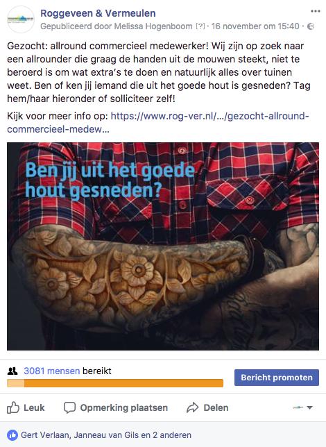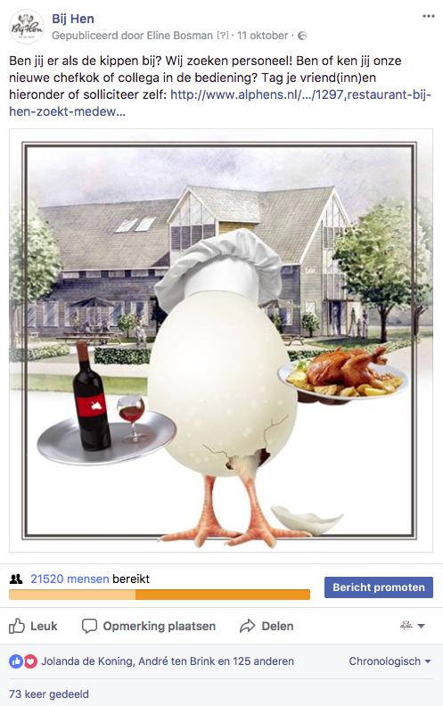 Wij maakten onder andere al onderstaande personeelsadvertenties voor bedrijven in Alphen aan den Rijn en omgeving. Die plaatsten we op eigen website, Alphens.nl en Facebook. Hieronder zie je steeds het facebookbericht om te laten zien hoe vaak vacatures worden gedeeld en hoeveel er wordt gereageerd, vooral als de vacature ook nog via Facebook Advertising wordt geboost. Dit kan al voor een laag bedrag, we adviseren je graag!