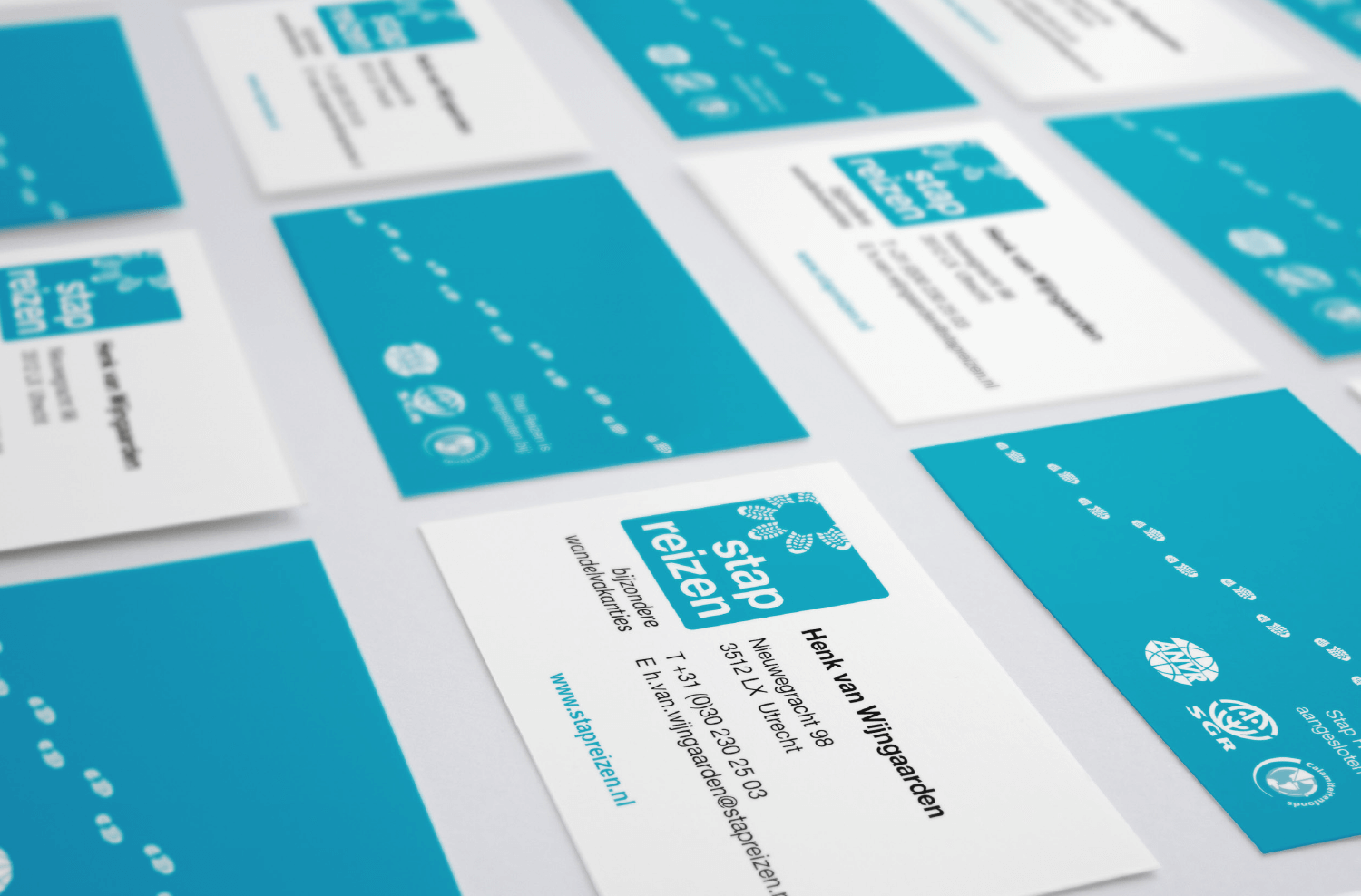 Voor zowel Stap Reizen als Trap Reizen verzorgde VRHL het ontwerp en de vormgeving van het nieuwe logo en nieuwe visitekaartjes, enveloppen en briefpapier. Onze vormgevers hebben hierbij goed nagedacht over passend beeld. Zo zijn er voeten in het nieuwe logo van Stap Reizen en fietsbanden in het nieuwe logo van Trap Reizen verwerkt.