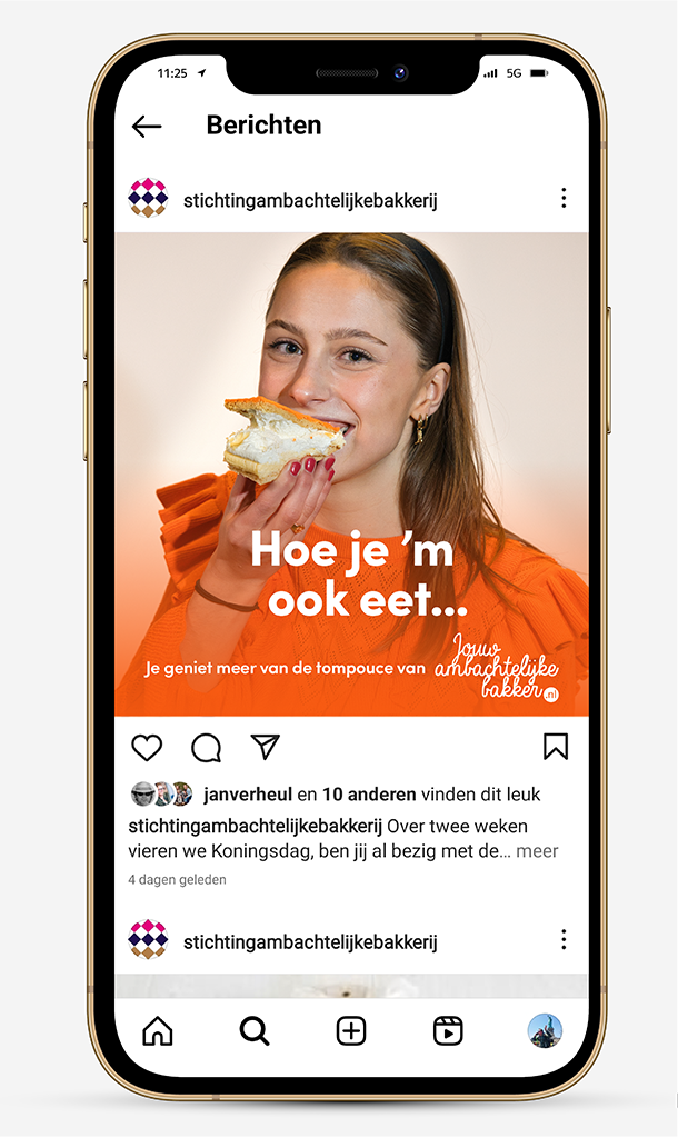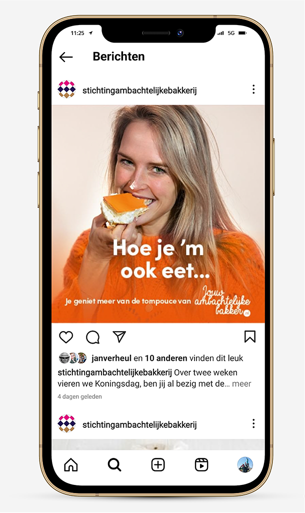 ‘Je geniet meer van de tompouce van jouw ambachtelijke bakker’, is de boodschap van de campagne. We maakten een toffe video voor Instagram Reels die de veelzijdigheid van het eten van een tompouce laat zien. Rond Koningsdag adverteren we de video op Facebook en Instagram. Ook zetten we de socialpostmaker in, waarmee bakkers een gepersonaliseerde social post in campagnestijl kunnen maken. We verzorgden de fotografie (en de modellen, in de persoon van Janneke en Amber). En de SAB zet landelijke banners in op NU.nl en AD.nl, waarvoor wij de vormgeving verzorgden.